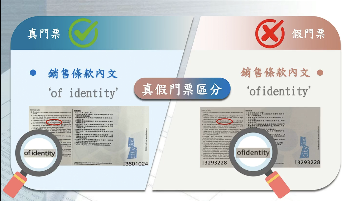 警方披露的真假门票区分。